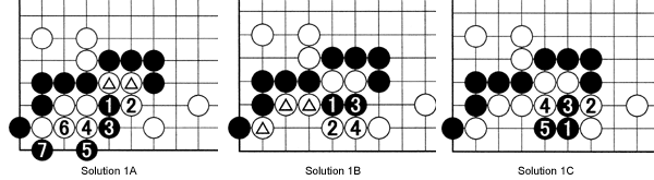 Solution 1A: If Black cuts at 1, and White wants to save his marked stones, he will play at 2. After black 3, any resistance by White is useless, as can be seen.