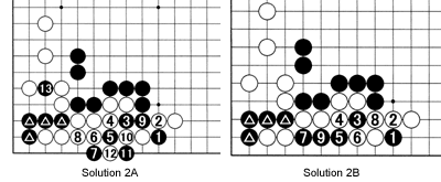 Solution 2A: After exchanging 1 for 2, black 3, 5 and 7 are a good combination. With 11, Black forces a ko to free the marked stones. Note that Black has ko threats around 13.