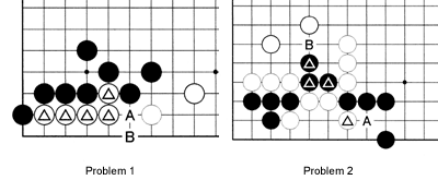 Problem 1: The exchange black A for white B is a case of aji-keshi for Black. How can he capture the marked stones?